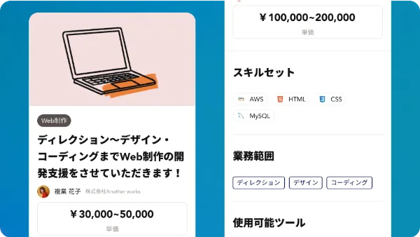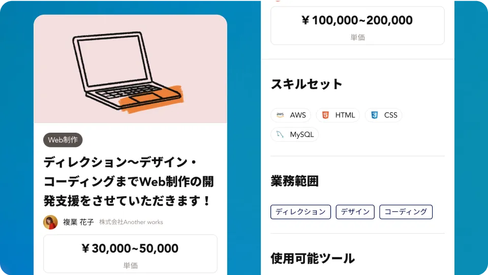 複業プロタレントは自ら得意な領域をスキルセットやタグを通じて明示しています。ツール名を含めより具体的な「できること」が可視化されており、ミスマッチなく依頼することが可能です。